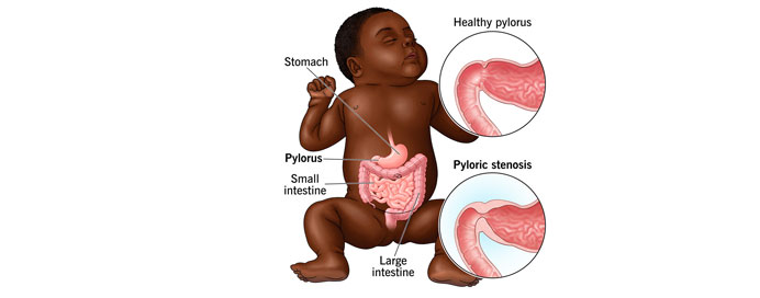 Pyloric Stenosis is a condition in infants where the muscle at the outlet of the stomach (pylorus) becomes abnormally thick, blocking food from entering the small intestine. It usually presents in the first few weeks of life and causes forceful vomiting, dehydration and poor weight gain. With timely diagnosis and a simple, safe surgical procedure, babies recover quickly and return to normal feeding within a short time.